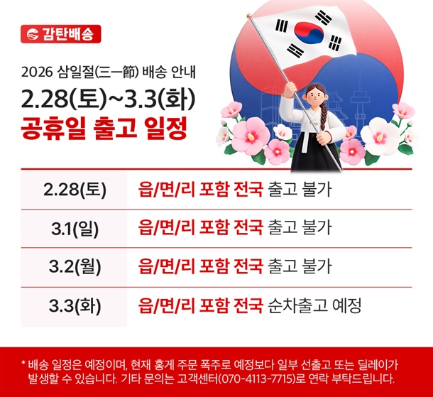 (공휴일, 기상악화 등 불가피한 상황에 따라 추가 지연될 수 있습니다.)