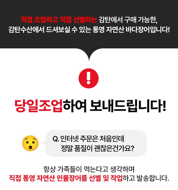 · 배송은 입금 확인 된 날짜로부터 1~3일 소요되며, 당일 조업 상품의 경우 날씨, 조업량 등의 영향으로 발송이 지연 될 수 있습니다.