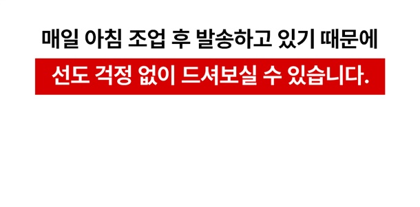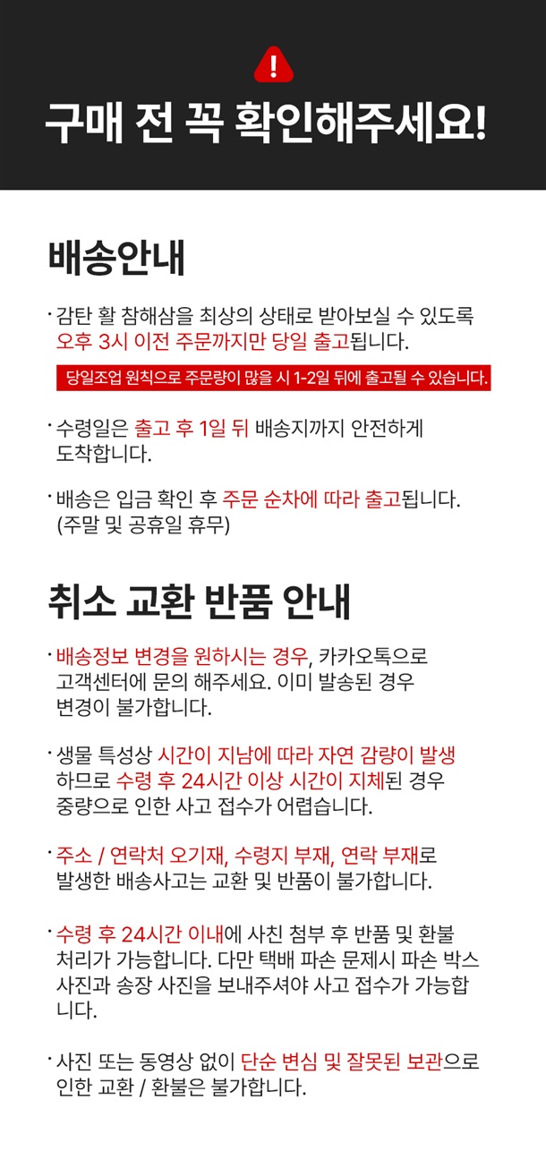 · 배송은 입금 확인 된 날짜로부터 1~3일 소요되며, 당일 조업 상품의 경우 날씨, 조업량 등의 영향으로 발송이 지연 될 수 있습니다.