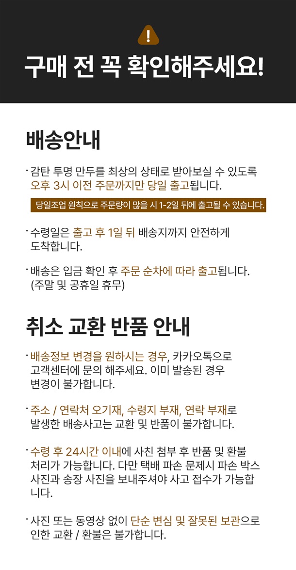 · 상품 별 당일 발송 마감 시간이 상이하여 상품 별 상세페이지 상단에 게시 되어있는 배송 안내 사항을 확인 부탁 드립니다.