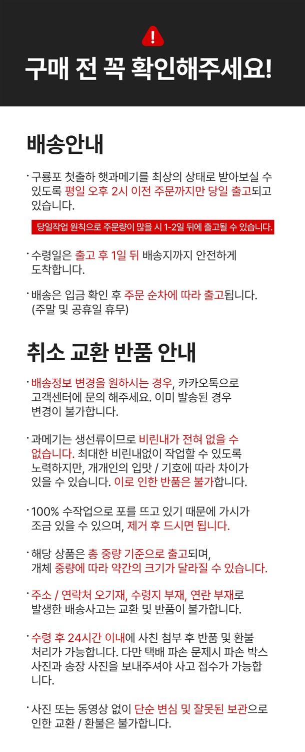 · 재판매가 불가한 신선식품 특성 상 단순 변심으로 인한 반품, 환불이 불가 합니다.