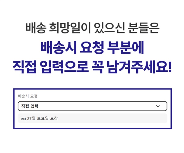 · 상품 별 당일 발송 마감 시간이 상이하여 상품 별 상세페이지 상단에 게시 되어있는 배송 안내 사항을 확인 부탁 드립니다.