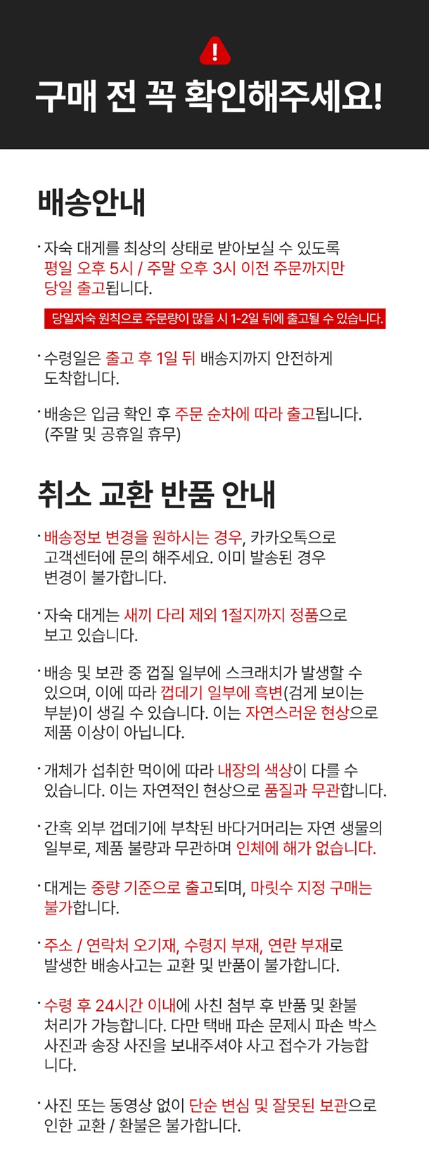 · 배송은 입금 확인 된 날짜로부터 1~3일 소요되며, 당일 조업 상품의 경우 날씨, 조업량 등의 영향으로 발송이 지연 될 수 있습니다.