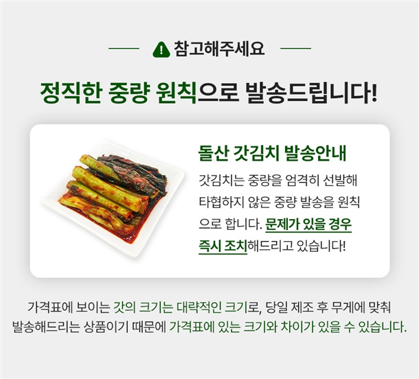 · 배송은 입금 확인 된 날짜로부터 1~3일 소요되며, 당일 조업 상품의 경우 날씨, 조업량 등의 영향으로 발송이 지연 될 수 있습니다.