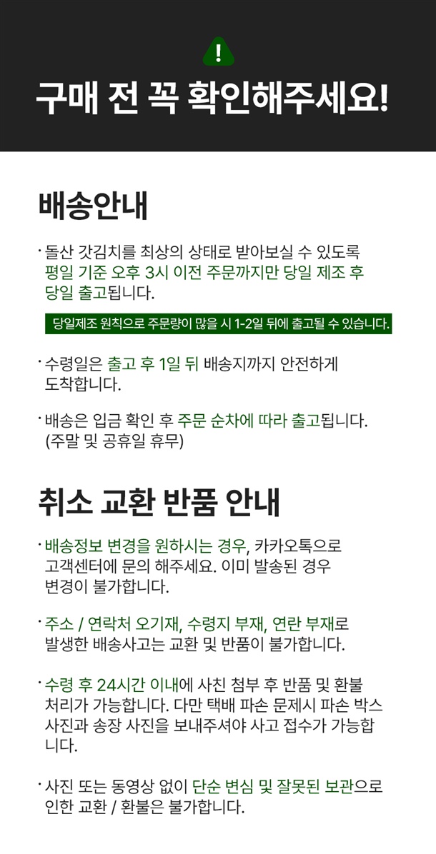 · 상품 별 당일 발송 마감 시간이 상이하여 상품 별 상세페이지 상단에 게시 되어있는 배송 안내 사항을 확인 부탁 드립니다.